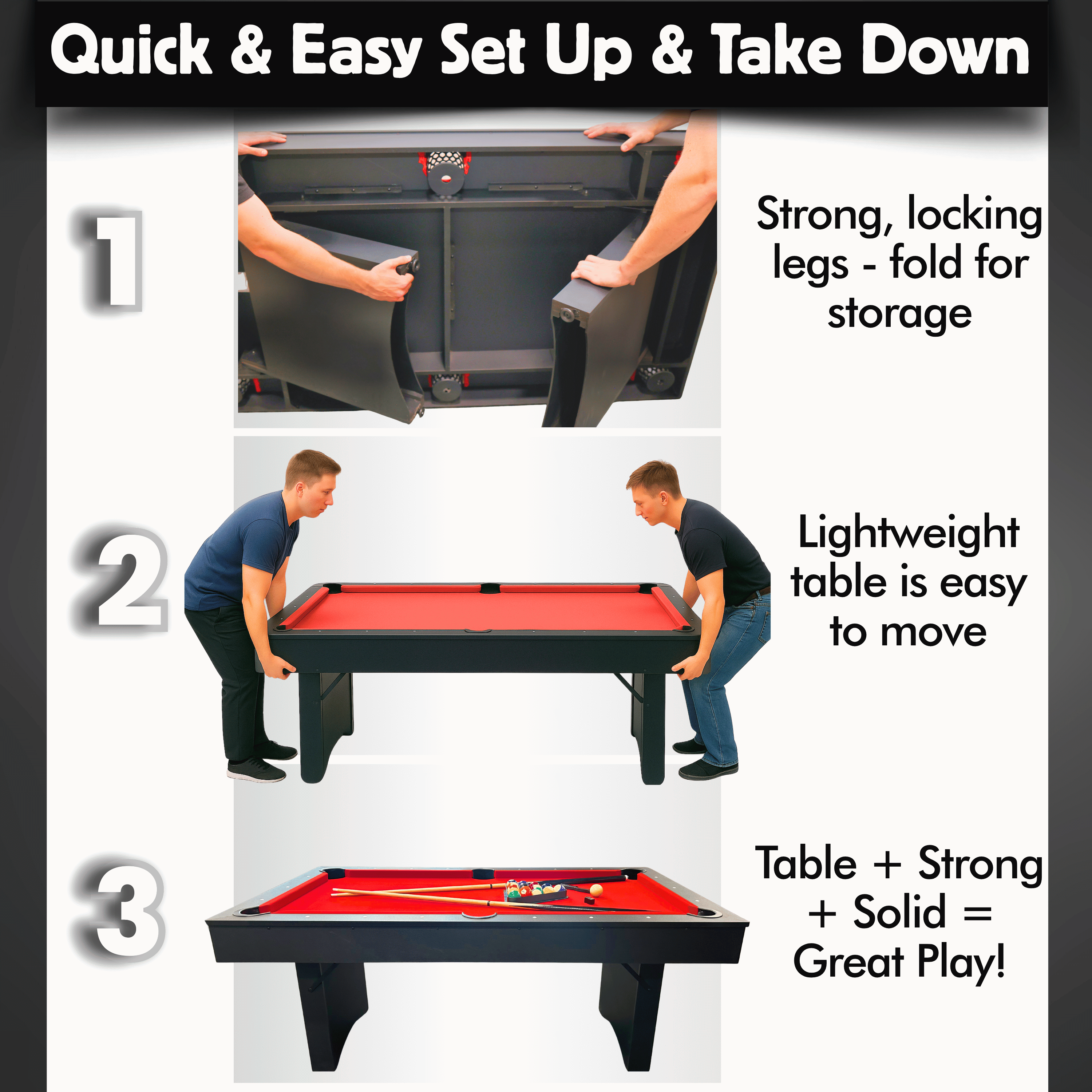 The compact dimensions of our portable pool table make it a great size for kids to learn the game of pool. The Ashford's 6' dimensions make it easier for kids to practice the basics of pool and sink some shots. Adults will appreciate the solid feel of our table and love the way it plays like a full-sized table. The Ashford portable pool table is almost ready to play right out of the box.