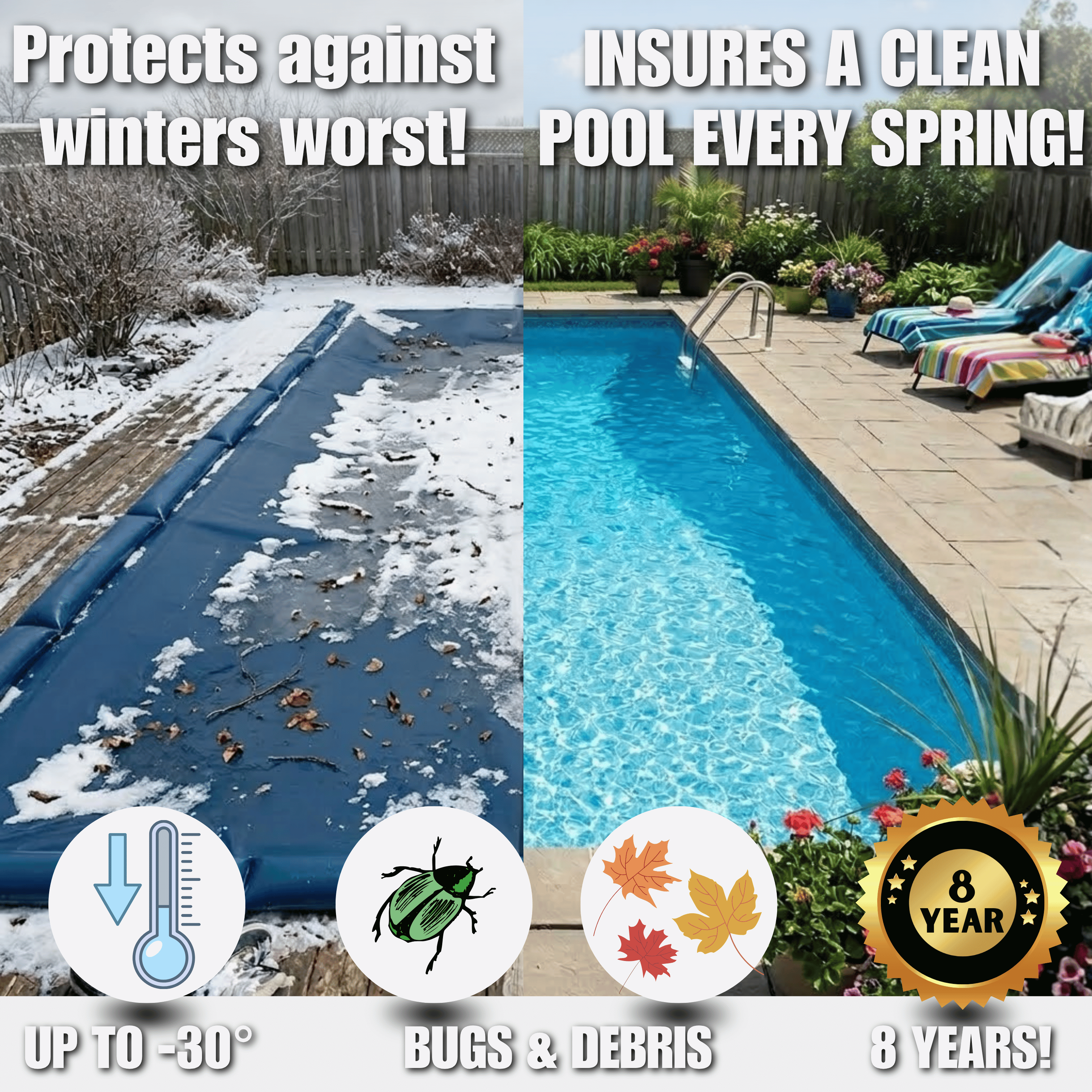 The polyethylene coating on our Unrippable™ covers is thick loaded with UV stabilizer to protect it from the damaging effects of sunlight. The black underside of the cover retards algae growth and insures a clean pool each spring.